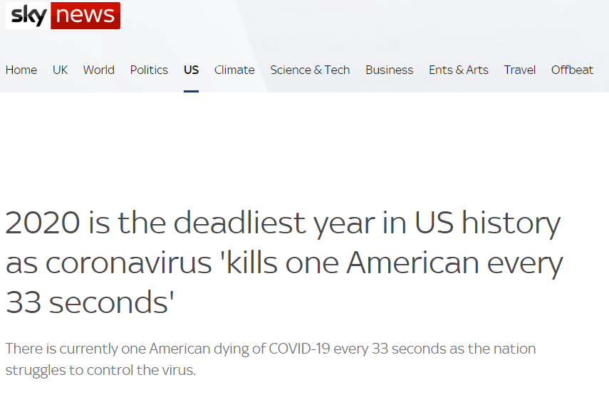 Μάλιστα, η προηγούμενη εβδομάδα ήταν η πιο θανατηφόρα στην πανδημία με πάνω από 18.000 νεκρούς και σίγουρα ο Δεκέμβριος θα είναι ο πιο «μαύρος» μήνας της πανδημίας. Σύμφωνα μάλιστα με το Reuters, κάθε 33 δευτερόλεπτα ένας άνθρωπος έχανε τη ζωή του στην άλλη άκρη του Ατλαντικού!