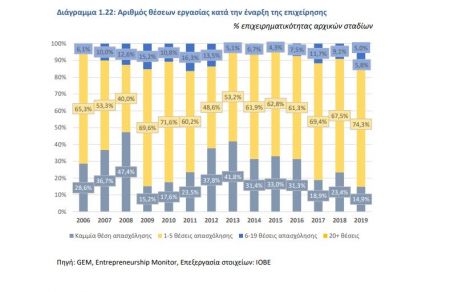 Ωστόσο, διαφαίνεται ενίσχυση του μέσου μεγέθους των νέων εγχειρημάτων κατά την έναρξη λειτουργίας, καθώς μόλις το 15% των εγχειρημάτων (από 23,4% το 2018) προσφέρει απασχόληση αποκλειστικά στους ιδρυτές του. Ταυτόχρονα, βελτιώνονται σημαντικά και οι προσδοκίες απασχόλησης στο μέλλον, καθώς το 95% εκτιμούν ότι την επόμενη πενταετία θα δημιουργήσουν τουλάχιστον μια θέση εργασίας.