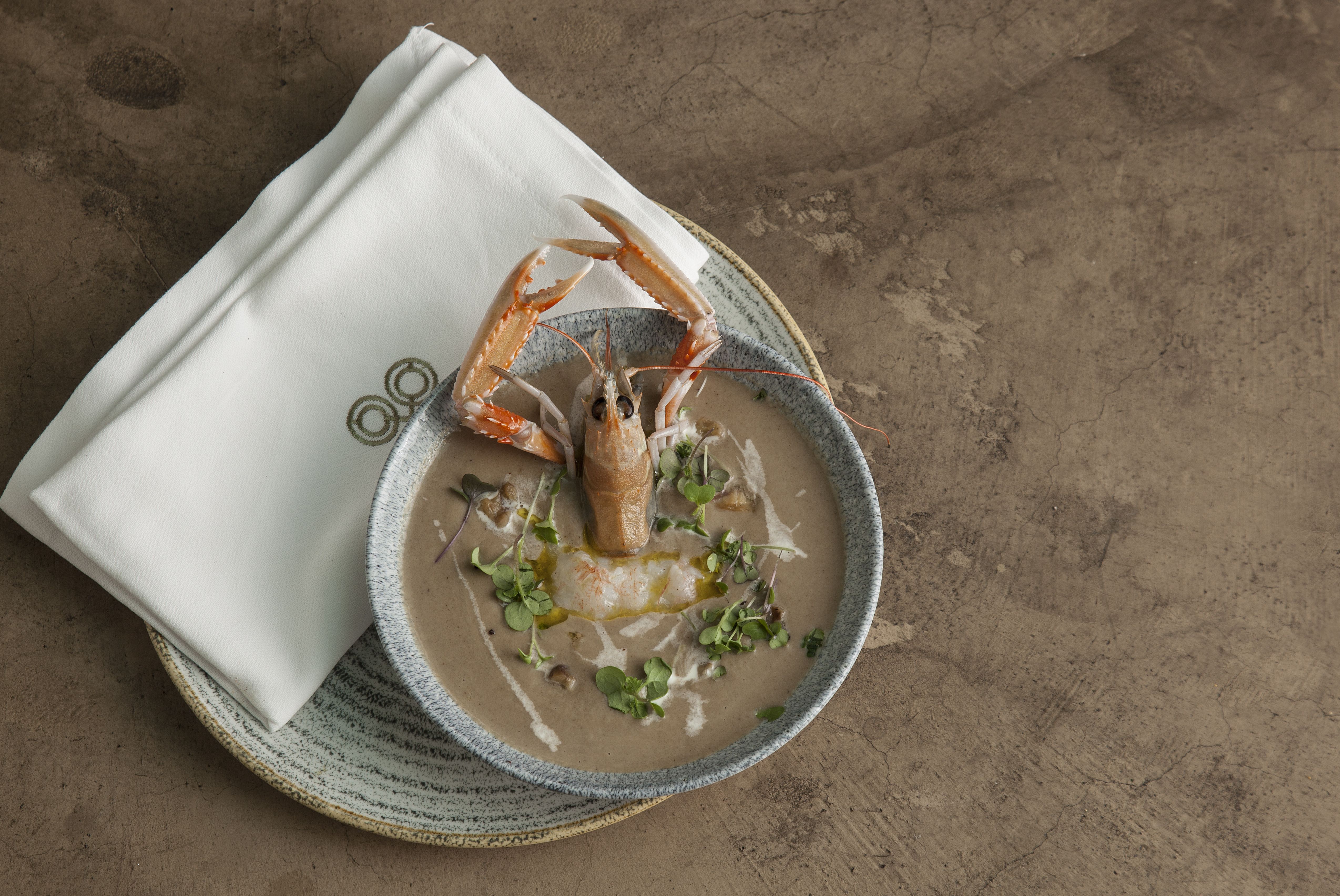 Σερβίρουμε τη σούπα, βάζουμε σε κάθε πιάτο μία καραβίδα και τελειώνουμε με λίγη σάλτσα vinsanto.