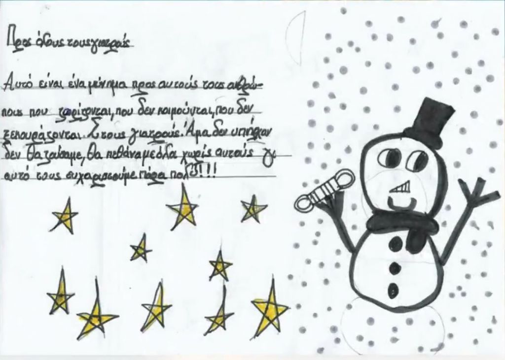 «Να ξέρετε πως εμείς είμαστε δίπλα σας και σας στηρίζουμε πάρα, μα πάρα πολύ!!! Δεν σας ξεχνάμε και ξέρουμε πόσο δύσκολα περνάτε στα νοσοκομεία. Εμείς ακόμη και αν δεν σας ξέρουμε σας αγαπάμε πολύ, πολύ», γράφει ένας μαθητής.