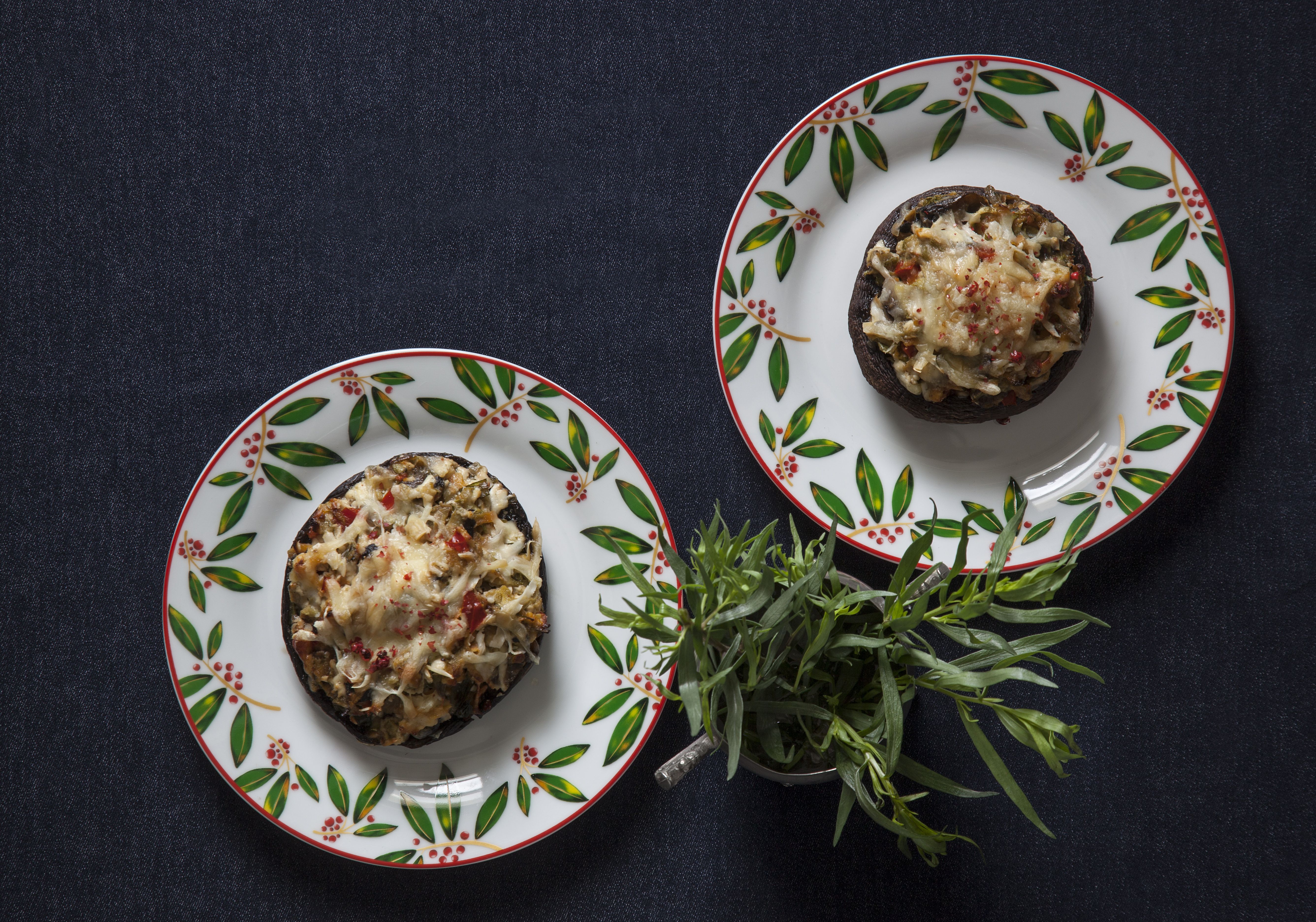 Ψιλοκόβουμε την πιπεριά, το σκόρδο, το πράσο και το καρότο. Σοτάρουμε σε λίγο λάδι, για λίγο, το κρεμμύδι, κατόπιν την πιπεριά και το τριμμένο καρότο. Προσθέτουμε αλατοπίπερο και τα φρέσκα αρωματικά βότανα ψιλοκομμένα (ή τα ξερά φύλλα εστραγκόν), το σκόρδο και τη σάρκα από τα μανιτάρια και αποσύρουμε από τη φωτιά.