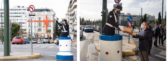 Δώρα σε τροχονόμους, οι οποίοι εκτελούσαν υπηρεσία ρύθμισης της κυκλοφορίας σε διάφορες περιοχές της Αττικής, προσέφερε συμβολικά σήμερα (31 Δεκεμβρίου 2020) η Πολιτική και Φυσική Ηγεσία της Ελληνικής Αστυνομίας.