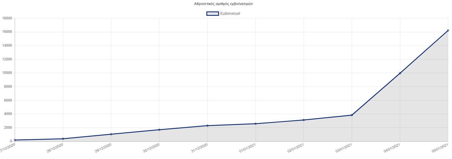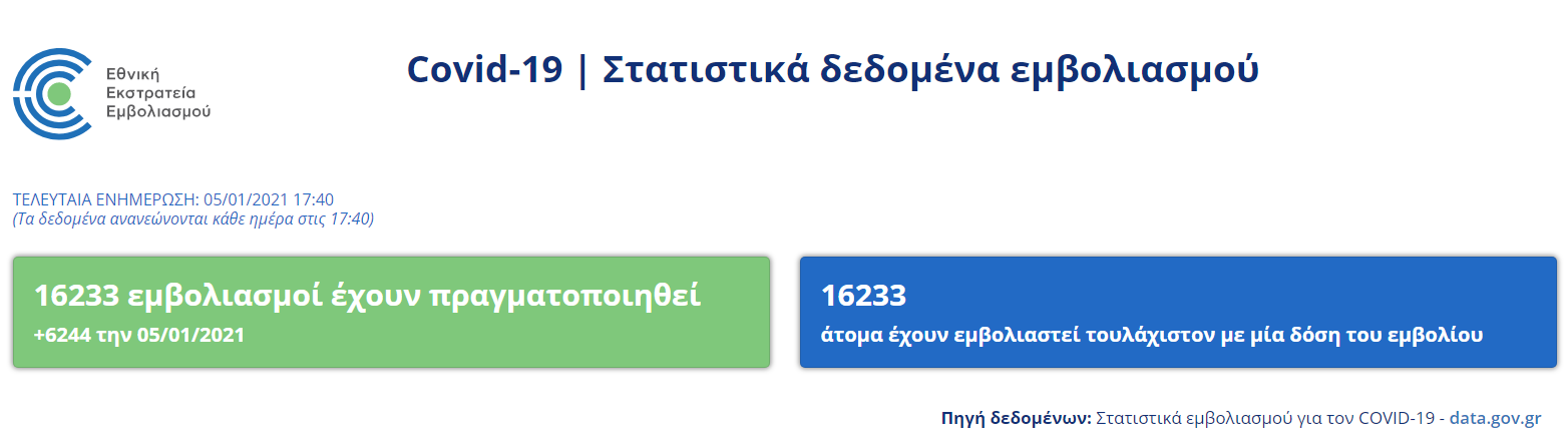 Σύμφωνα, λοιπόν, με την εν λόγω πλατφόρμα, αυτή τη στιγμή έχουν εμβολιαστεί στην Ελλάδα 16.233 άνθρωποι. Μάλιστα, σήμερα πραγματοποίησαν το εμβόλιο 6.244 πολίτες.