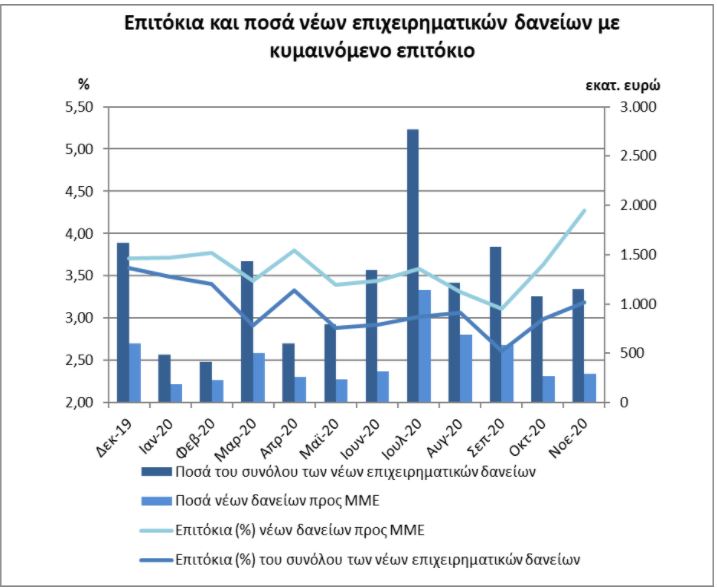 Το μέσο επιτόκιο των νέων επιχειρηματικών δανείων με συγκεκριμένη διάρκεια και κυμαινόμενο επιτόκιο αυξήθηκε, το Νοέμβριο του 2020, κατά 16 μονάδες βάσης στο 3,08%, ενώ το αντίστοιχο ποσό των δανείων αυξήθηκε σε 1.153 εκατ. ευρώ έναντι 1.080 εκατ. ευρώ τον προηγούμενο μήνα.