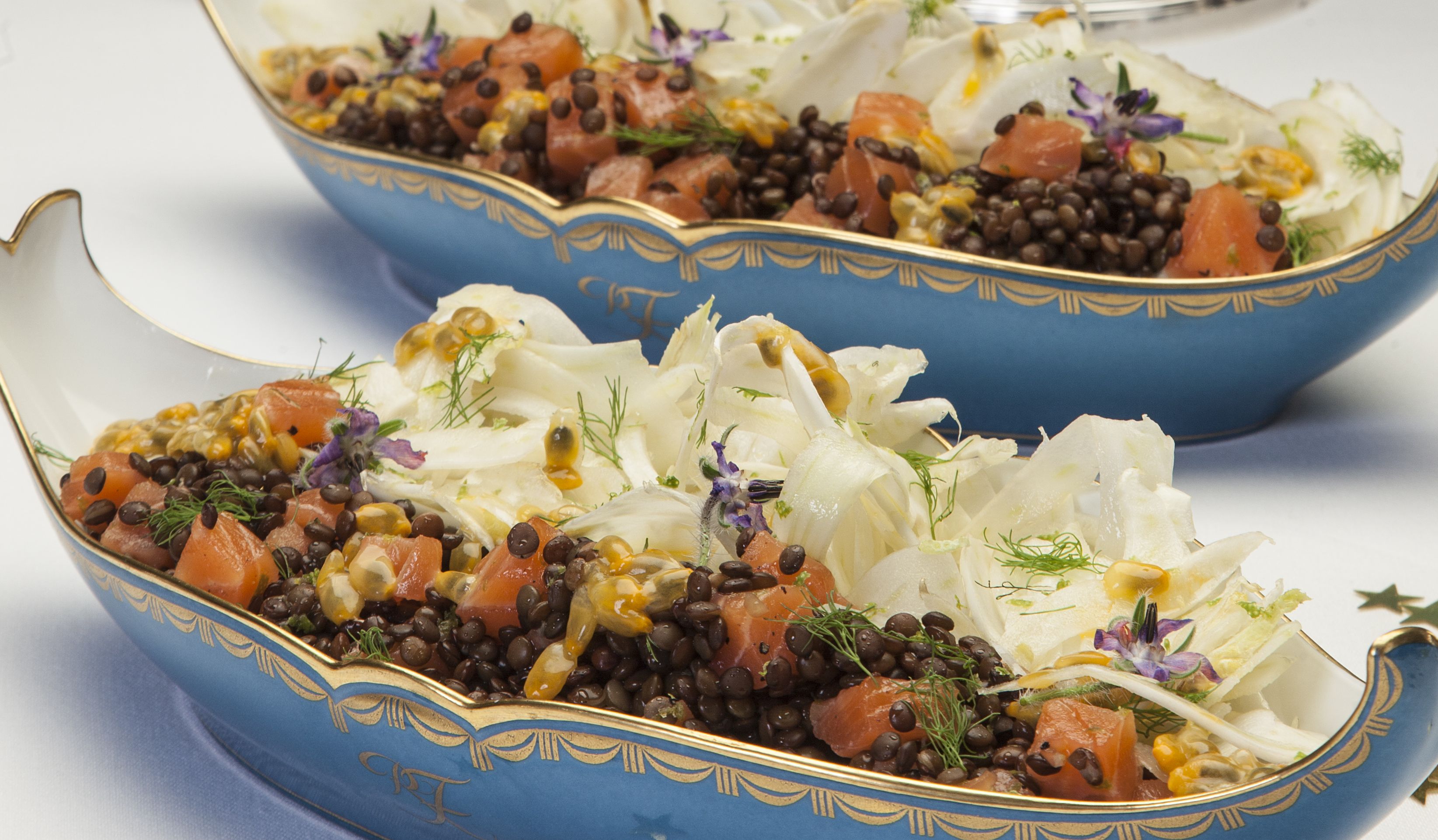 Στη συνέχεια, σουρώνουμε τις φακές και τις αφήνουμε να κρυώσουν. Τις σερβίρουμε σε μια σαλατιέρα και προσθέτουμε τον σολομό, το ελαιόλαδο, το ντρέσινγκ, τον χυμό από το ένα λεμόνι και αλατοπίπερο. Δοκιμάζουμε την οξύτητα και αν χρειαστεί προσθέτουμε χυμό ή ξύσμα από λεμόνι.