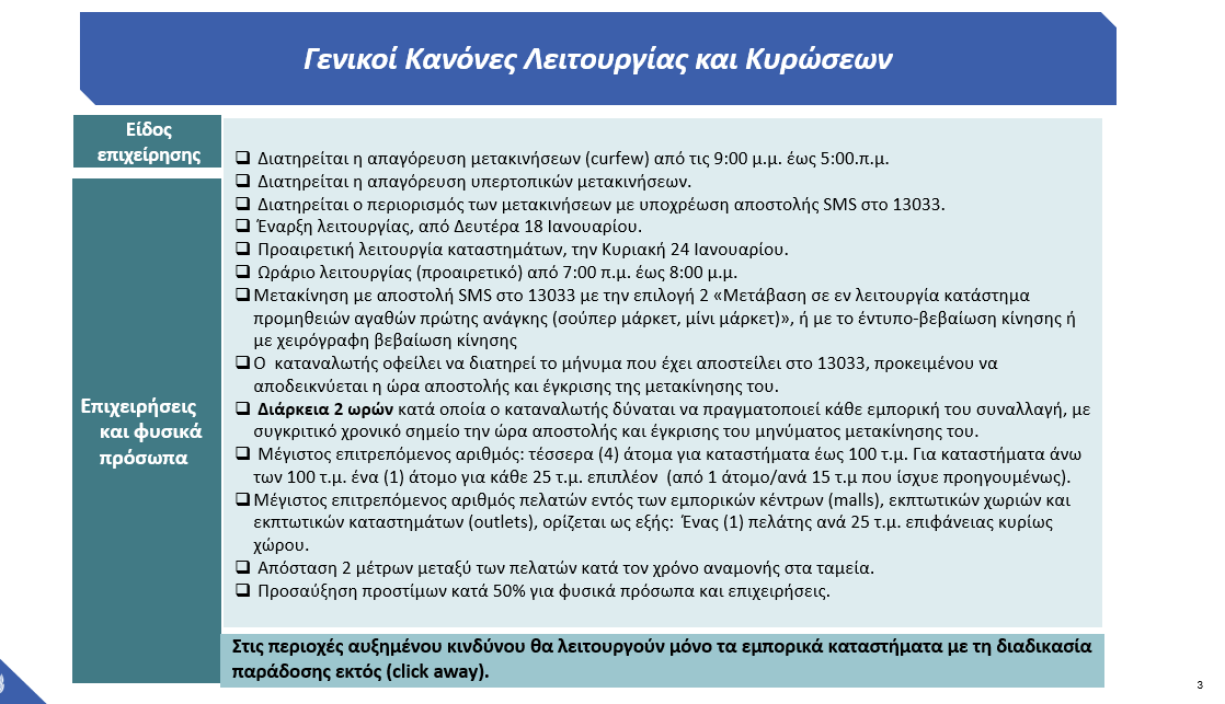 Σε αυτό το πλαίσιο, σε εφαρμογή παραμένει η απαγόρευση κυκλοφορίας από τις 21:00 έως τις 05:00 και η μετακίνηση στο διάστημα αυτό γίνεται μόνο για λόγους εργασίας, ή για λόγους υγείας.