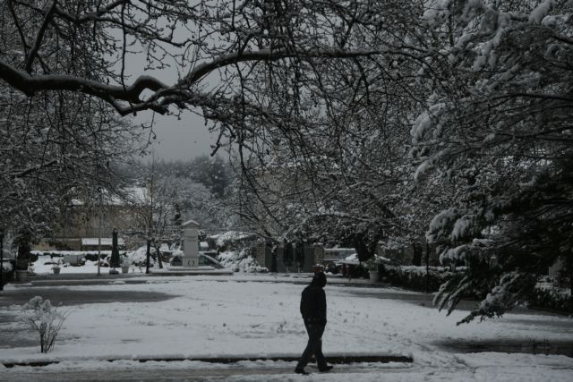 Η πυκνή χιονόπτωση άρχισε τα ξημερώματα και συνεχίζεται ακόμη και στο κέντρο της πόλης.
