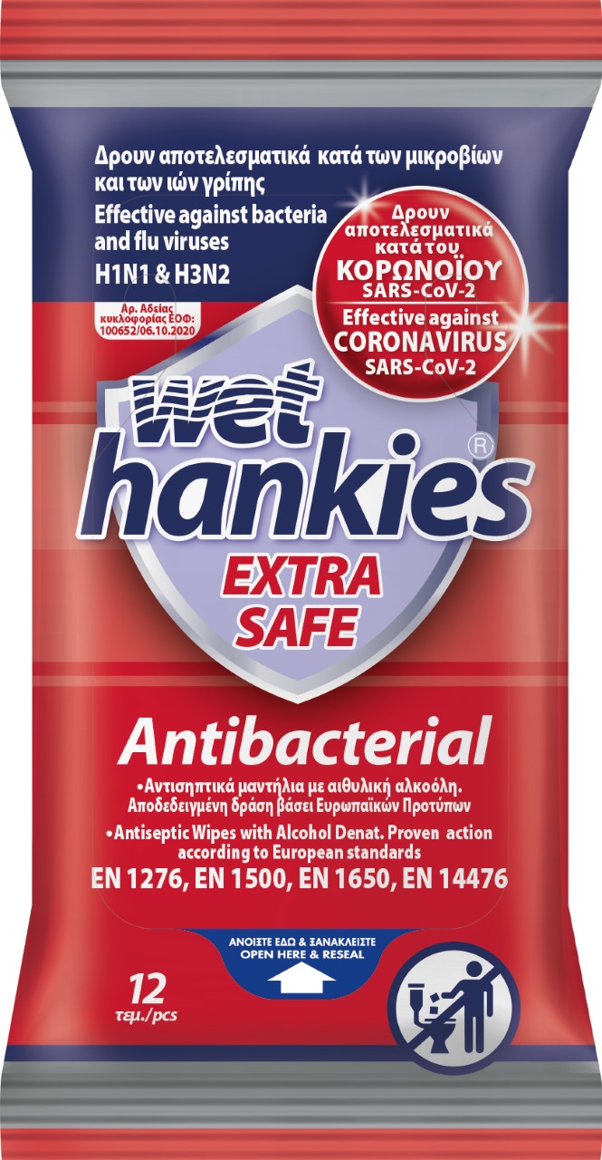 Ενα πακέτο υγρά αντιβακτηριδιακά μαντηλάκια Wet Hankies Extra Safe.