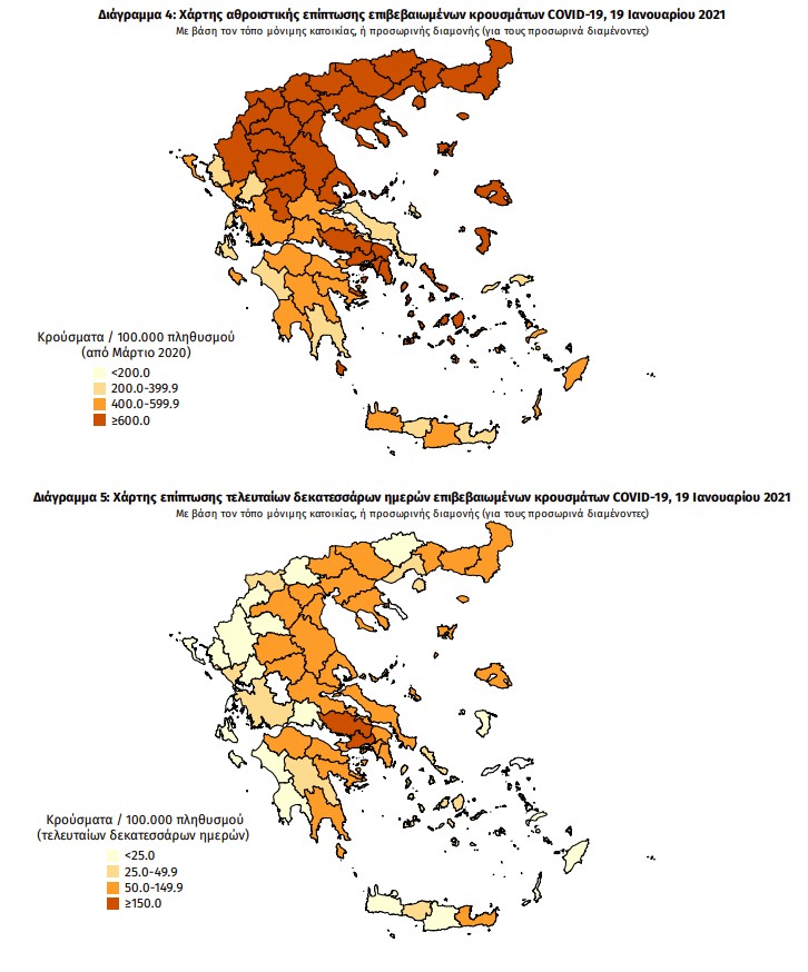 Ο χάρτης αποτυπώνει τη γεωγραφική κατανομή των συνολικών κρουσμάτων COVID-19 (από την αρχή της επιδημίας) ανά Περιφερειακή Ενότητα της χώρας, με βάση την δηλωθείσα διεύθυνση μόνιμης κατοικίας του ασθενούς, ή τη διεύθυνση προσωρινής διαμονής για τους τουρίστες και άλλους προσωρινά διαμένοντες στην Ελλάδα. Συμπεριλαμβάνονται τόσο κρούσματα με ιστορικό ταξιδίου (“εισαγόμενα”) όσο και κρούσματα με πιθανή εγχώρια μετάδοση.