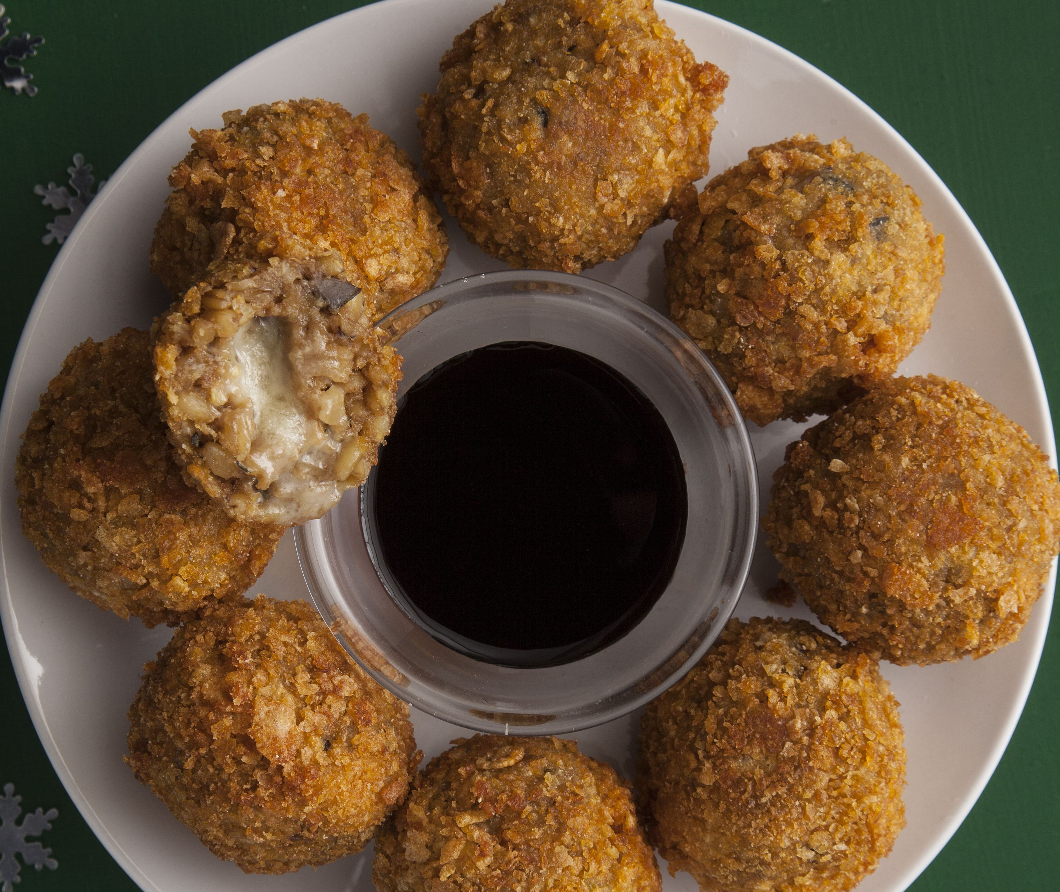 Μεταφέρουμε το μείγμα σε ένα ταψί και το απλώνουμε, για να κρυώσει (για 1 ώρα). Προσθέτουμε το αβγό και την παρμεζάνα και ανακατεύουμε να ομογενοποιηθεί το μείγμα. Πλάθουμε σε μπαλάκια βάρους 25-30 γρ. και βάζουμε στο κέντρο τους από έναν κύβο τυριού. Τα αφήνουμε για περίπου 30 λεπτά στο ψυγείο.