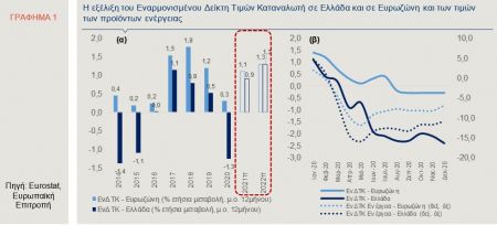Σύμφωνα με τις προβλέψεις της Ευρωπαϊκής Επιτροπής (European Economic Forecast, Autumn, Νοέμβριος 2020), παράλληλα με την ανάκαμψη της οικονομικής δραστηριότητας που αναμένεται την επόμενη διετία, θα σημειωθεί άνοδος του επιπέδου τιμών. Ειδικά για το 2021, σημειώνεται ότι η αύξηση του επιπέδου τιμών, θα προκύψει -ως ένα βαθμό- από τις επιδράσεις βάσης (base effects).Συγκεκριμένα, ο ΕνΔΤΚ προβλέπεται ότι θα αυξηθεί, το 2021, κατά 0,9% στην Ελλάδα και κατά 1,1% στην Ευρωζώνη, ενώ, το 2022, αναμένεται ΄να αυξηθεί με τον ίδιο ρυθμό και στις δύο περιοχές της τάξης του 1,3% (Γράφημα 1α).