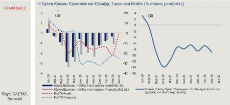 Η πορεία των τιμών αγαθών και υπηρεσιών, κατά τη διάρκεια του 2020, στην Ελλάδα, συμβαδίζει με την εξέλιξη του κύκλου εργασιών για τους αντίστοιχους κλάδους (Γράφημα 2α). Συγκεκριμένα, σύμφωνα με τα στοιχεία της ΕΛΣΤΑΤ για τις επιχειρήσεις με υποχρέωση τήρησης διπλογραφικών βιβλίων, ο κύκλος εργασιών των κλάδων που παρέχουν υπηρεσίες (περιλαμβάνει Χονδρικό και Λιανικό εμπόριο, Καταλύματα-Εστίαση, Μεταφορές, Χρηματοπιστωτικές και Ασφαλιστικές Δραστηριότητες, Δημόσιο Τομέα κ.λπ.) μειώθηκε, το πρώτο ενδεκάμηνο του 2020, σε σύγκριση με το αντίστοιχο διάστημα του 2019, κατά 15,5%, ενώ ο κύκλος εργασιών των κλάδων που αφορούν στην παραγωγή αγαθών (περιλαμβάνει Γεωργία, Βιομηχανία, Κατασκευές) μειώθηκε με ηπιότερο ρυθμό (-11,1%, σε ετήσια βάση).