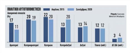 Το ποσοστό όσων δηλώνουν ότι αυτοτοποθετούνται στον ευρύτερο χώρο του Κέντρου αυξήθηκε τα τελευταία πέντε χρόνια. Το γεγονός αυτό αποδίδεται σε δύο βασικούς παράγοντες. Ο πρώτος είναι η μείωση της δύναμης της Αριστεράς στο εκλογικό σώμα. Οπως προκύπτει από τα διαχρονικά στοιχεία των μετρήσεων της Metron Analysis, που έχουν να κάνουν με τον δείκτη «πολιτικής αυτοπεποίθησης», το ποσοστό όσων δήλωναν αριστεροί έπεσε στο 11% τον Σεπτέμβριο του 2020, από το 17% που βρισκόταν τον Απρίλη του 2015. Η μείωση αυτή ερμηνεύεται ως το επακόλουθο της εμπειρίας της διακυβέρνησης της χώρας από τον ΣΥΡΙΖΑ. Στα ίδια επίπεδα, με μικρή μείωση, κινείται το ποσοστό όσων δηλώνουν κεντρώοι και κεντροαριστεροί.