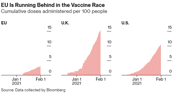 Μέχρι στιγμής, η ΕΕ έχει χορηγήσει κατά μέσο όρο μόλις 3 δόσεις ανά 100 άτομα, πολύ πίσω από τις 15 στο Ηνωμένο Βασίλειο και 10 στις ΗΠΑ, σύμφωνα με το Bloomberg Vaccine Tracker. Εν τω μεταξύ, εξαπλώνονται τα περισσότερο μεταδοτικά στελέχη του κοροναϊού, αναγκάζοντας τις κυβερνήσεις να επεκτείνουν τα μέτρα.