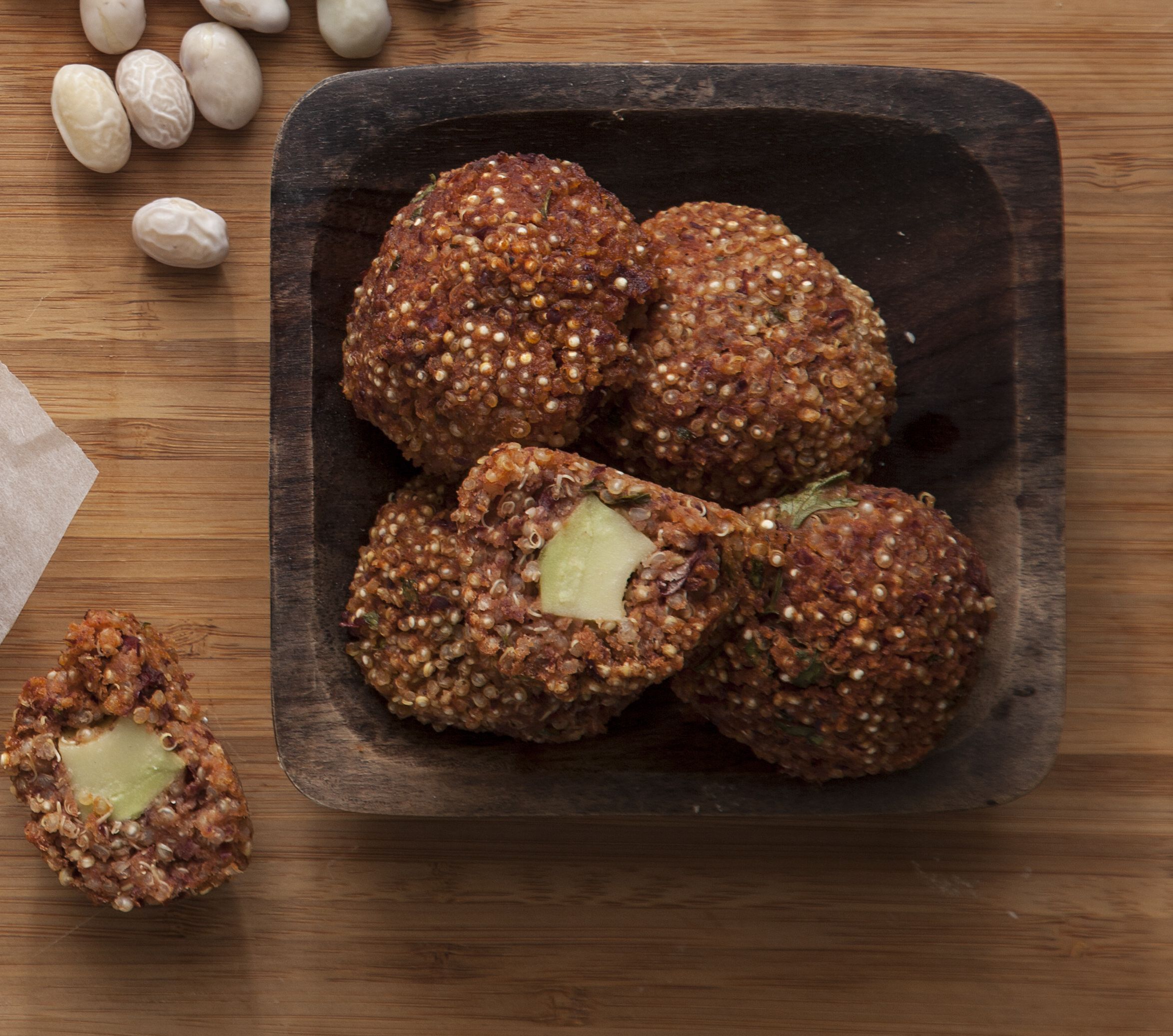 Χτυπάμε στο μπλέντερ τα φασόλια, τον πελτέ, την αγαύη, το σκόρδο, το ψωμί, την καυτερή σάλτσα, το αλάτι και πιπέρι, μέχρι να γίνουν σαν πουρές. Αδειάζουμε το μείγμα σε ένα μπολ και προσθέτουμε την κινόα και τον μαϊντανό. Ζυμώνουμε πολύ καλά με τα χέρια μας και πλάθουμε σε μπαλάκια βάρους περίπου 30 γρ. το καθένα. Βάζουμε σε κάθε μπαλάκι από έναν κύβο αβοκάντο. Τοποθετούμε τους κεφτέδες σε ένα αντικολλητικό ταψί ή στη λαμαρίνα του φούρνου που έχουμε ντύσει με λαδόκολλα και ψήνουμε για 20΄-25΄.
