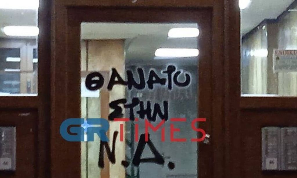 Όπως αναφέρει το GRtimes.gr, άτομα – μέλη του ευρύτερου αντιεξουσιαστικού χώρου που συμμετείχαν στην πορεία κατά του Νομοσχεδίου του Υπ. Παιδείας στο κέντρο της Θεσσαλονίκης βγήκαν από την πορεία και έγραψαν το σύνθημα στην πόρτα του κτηρίου.