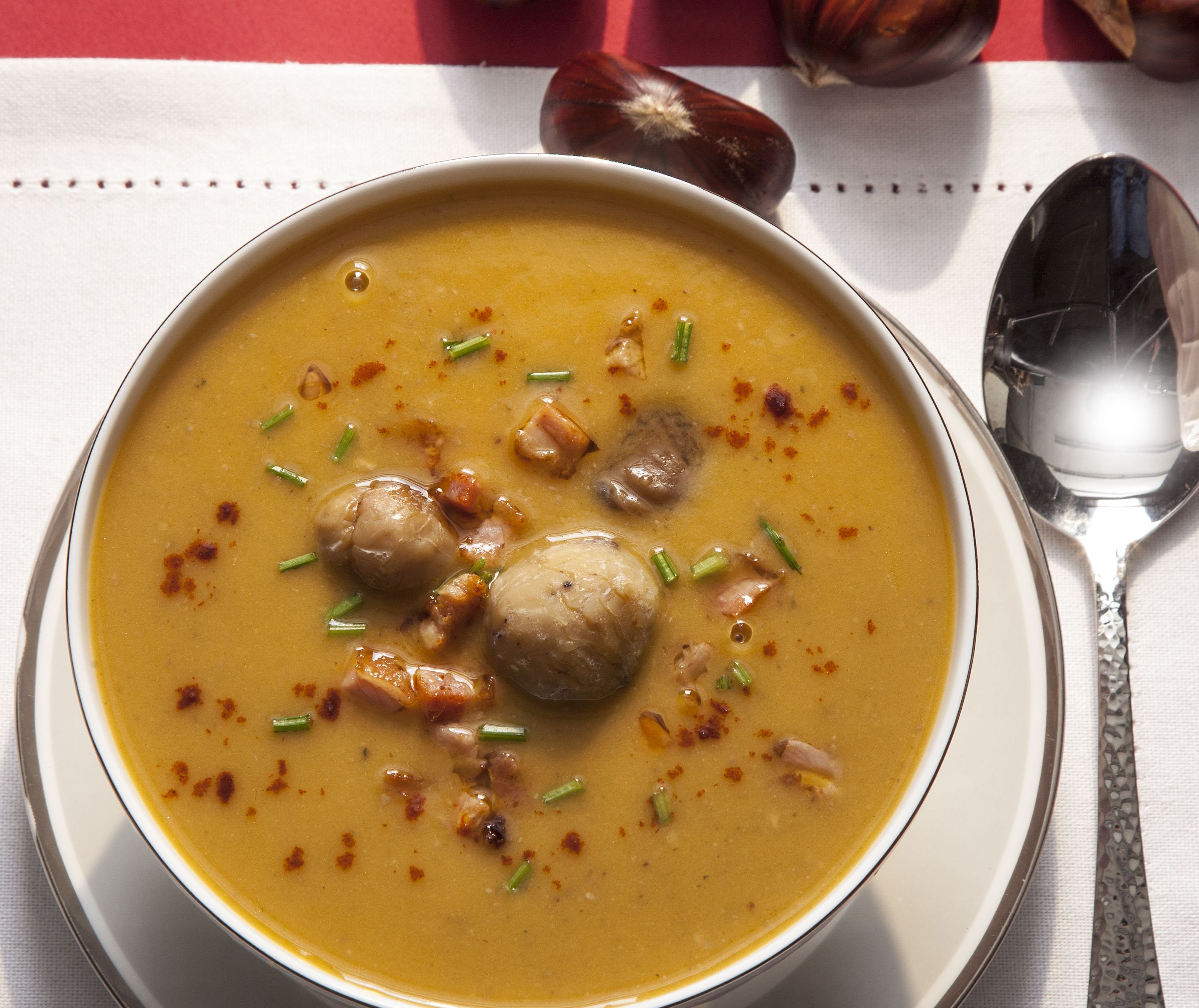 Σε ένα αντικολλητικό τηγάνι λιώνουμε 30 γρ. βούτυρο και καραμελώνουμε ξεχωριστά τα κάστανα και ξεχωριστά το μπέικον σε μεγάλους κύβους.