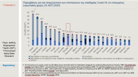 Όπως παρατηρείται στο Γράφημα 2, τα συνολικά μέτρα που έθεσε σε εφαρμογή η ελληνική κυβέρνηση, ως ποσοστό του εκτιμώμενου ΑΕΠ του 2020 (15,3%), υπερβαίνουν ελαφρώς τη διάμεση τιμή για τις επιλεγμένες χώρες (14,4%).