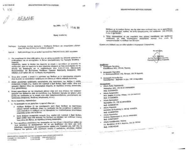 Στο παρακάτω έγγραφο της ΔΕΔΔΗΕ προς δήμους και δασαρχεία η υπηρεσία γνωστοποιεί πως θα επιθεωρήσει και θα συντηρήσει το δίκτυο ηλεκτροδότησης της περιοχής Φιλοθέης-Κηφισιάς ζητώντας έτσι τους αποδέκτες του email να κλαδευτούν όσα δέντρα γειτνιάζουν με αγωγούς.