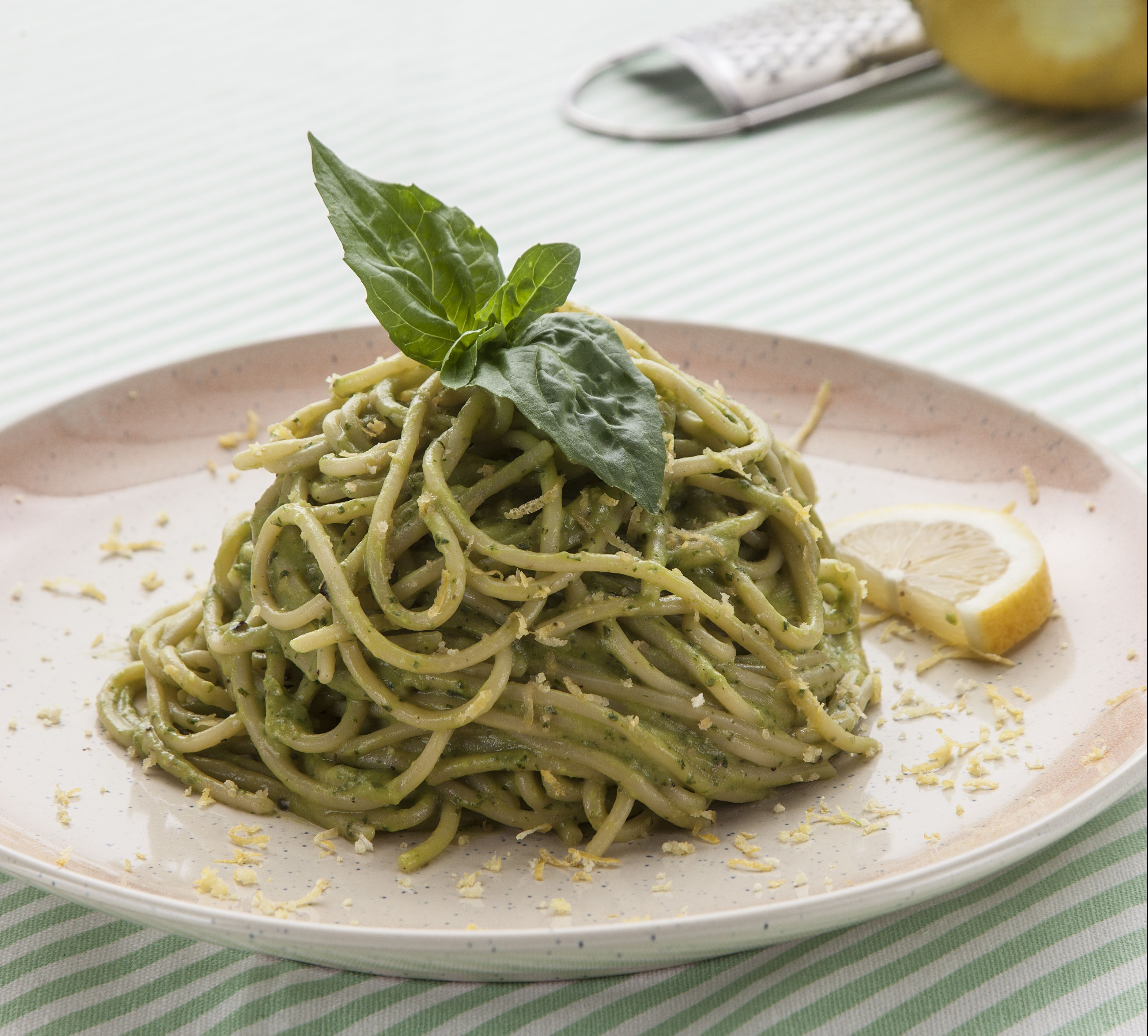 Βράζουμε τα ζυμαρικά σύμφωνα με τις οδηγίες που αναγράφονται στη συσκευασία τους. Στο μεταξύ, χτυπάμε στο μπλέντερ το σκόρδο και τον δυόσμο, να ψιλοκοπούν. Προσθέτουμε τον χυμό λεμονιού, το ελαιόλαδο, τα αβοκάντο, τις 2 κουτ. σούπας από το νερό των ζυμαρικών και τα χτυπάμε μέχρι να γίνουν ένα κρεμώδες μείγμα. Αν θέλουμε να το αραιώσουμε λίγο, προσθέτουμε ελαιόλαδο. Αλατοπιπερώνουμε.