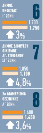 «Το Βήμα της Κυριακής» εξασφάλισε τις νέες προτεινόμενες τιμές από 10 περιοχές της Αττικής και της Θεσσαλονίκης και αυτό που προκύπτει είναι ότι σε κάθε περίπτωση προκύπτουν αυξήσεις οι οποίες κυμαίνονται από 2,6% έως 33%.
