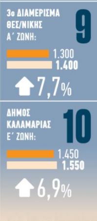 Τέλος, στον Δήμο Καλαμαριάς στην Ε΄ ζώνη η τιμή ανά τ.μ. σήμερα είναι 1.450 ευρώ και η νέα προτεινόμενη στα 1.550 ευρώ, δηλαδή αύξηση 100 € ή 6,9%.