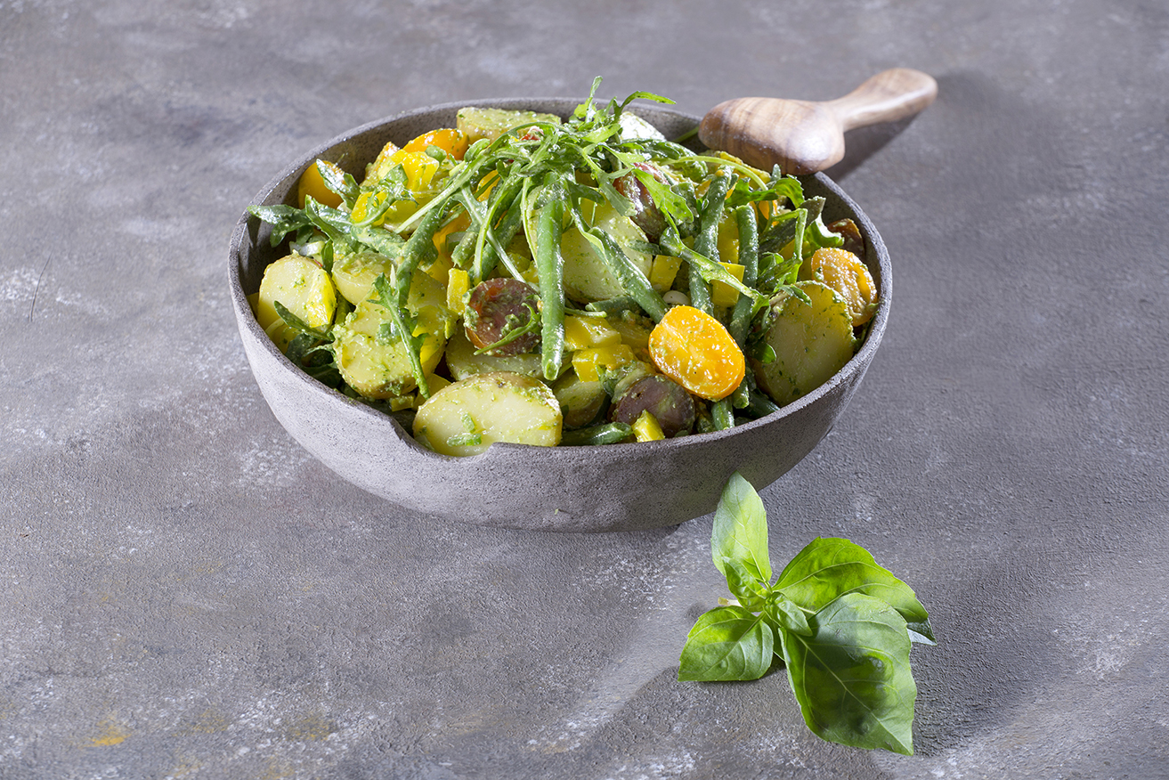 Κόβουμε τις πατάτες στα τέσσερα ή στα δύo. Τις βάζουμε σε ένα μπολ. Κόβουμε τα ντοματίνια στα δύο και τα βάζουμε στο μπολ με τις πατάτες. Προσθέτουμε και τα υπόλοιπα υλικά μας: την πιπεριά, το φρέσκο κρεμμυδάκι, τα φασολάκια και τη ρόκα. Προσθέτουμε, τέλος, το πέστο και ανακατεύουμε. Σερβίρουμε.