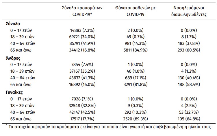 Οι νέοι θάνατοι ασθενών με COVID-19 είναι 46, ενώ από την έναρξη της επιδημίας έχουν καταγραφεί συνολικά 6.843 θάνατοι. Το 95.8% είχε υποκείμενο νόσημα ή/και ηλικία 70 ετών και άνω.