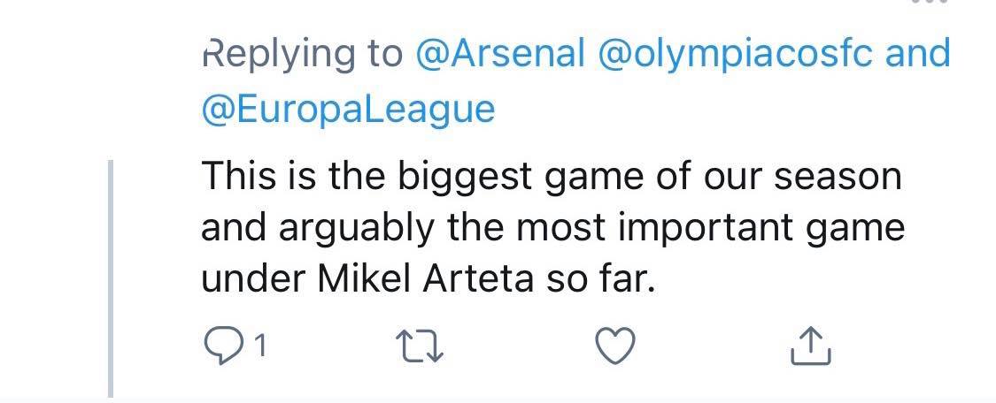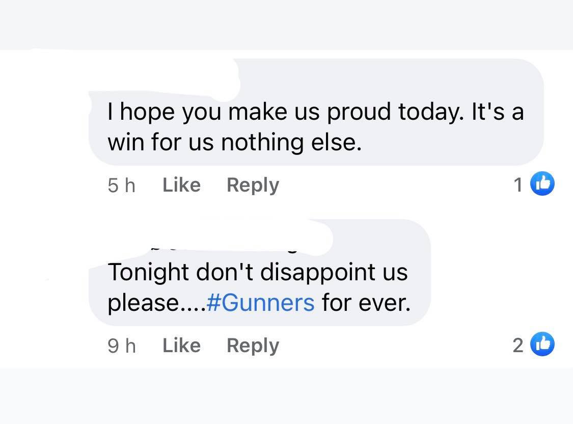 Τα σχόλια στα social media της αγγλικής ομάδας από τους φίλους της είναι εκατοντάδες και αυξάνονται συνεχώς, με αρκετούς εξ αυτών να τονίζουν πως το σημερινό παιχνίδι είναι το μεγαλύτερο και το πιο σημαντικό στην καριέρα του Μικέλ Αρτέτα στον πάγκο των κανονιέρηδων μέχρι και σήμερα, αφού ένας ενδεχόμενος αποκλεισμός θα στείλει πιθανότητα εκτός Ευρώπης για τη νέα σεζόν την ομάδα του Λονδίνου.