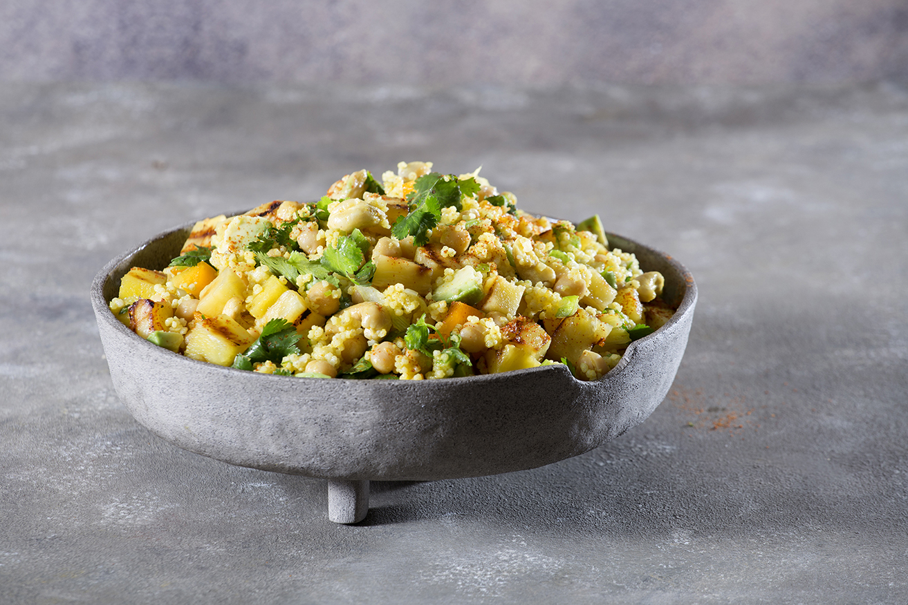Βράζουμε το κεχρί για 10’-15’. Το σουρώνουμε καλά και το σκεπάζουμε με μια πετσέτα για να τραβήξει την υγρασία. Ζεσταίνουμε καλά ένα αντικολλητικό τηγάνι-γκριλιέρα και ψήνουμε τις φέτες του ανανά και από τις δύο πλευρές. Ετοιμάζουμε όλα τα υπόλοιπα υλικά, εκτός από τα κάσιους και τον ανανά, και τα ρίχνουμε σε ένα μπολ μαζί με το κεχρί. Κόβουμε τον ανανά σε μικρά κομμάτια και ανακατεύουμε τον μισό στο μπολ με τα υπόλοιπα υλικά. Χοντροκόβουμε και τα κάσιους και προσθέτουμε τα μισά στο μπολ με τη σαλάτα.
