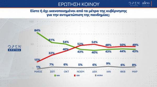 Παρότι το 49% των πολιτών δεν είναι ικανοποιημένοι από τα μέτρα της κυβέρνησης για την αντιμετώπιση της πανδημίας, ένα εξίσου μεγάλο ποσοστό, της τάξης του 43%, δηλώνει ικανοποίηση.