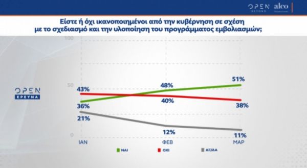 Η πλειοψηφία των ερωτηθέντων, σε ποσοστό 51%, δηλώνουν ικανοποιημένοι από την κυβέρνηση σε σχέση με τον σχεδιασμό και την υλοποίηση του προγράμματος εμβολιασμών, ενώ το 38% απάντησε «όχι».
