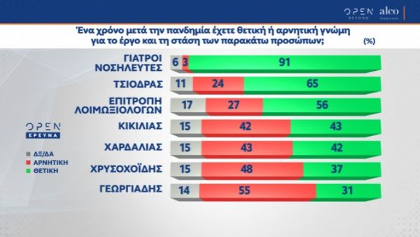 Ένα χρόνο μετά την πανδημία, οι πολίτες έχουν θετική γνώμη για το έργο και τη στάση, πρωτίστως, των γιατρών και νοσηλευτών, όπως είναι φυσικό, σε ποσοστό 91%. Και ακολουθούν ο καθηγητής Σωτήρης Τσιόδρας, για τον οποίο εκφράζουν θετική γνώμη σε ποσοστό 65% και η Επιτροπή των λοιμωξιολόγων (56%).