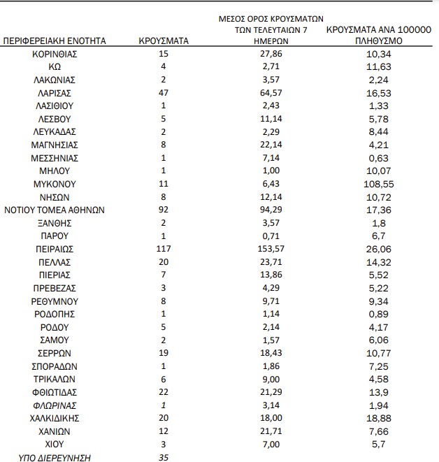 Τέλος Δυτική Αττική και νησιά του Αργοσαρωνικού καταγράφουν 57 και 8 νέες επιβεβαιωμένες μολύνσεις αντίστοιχα.