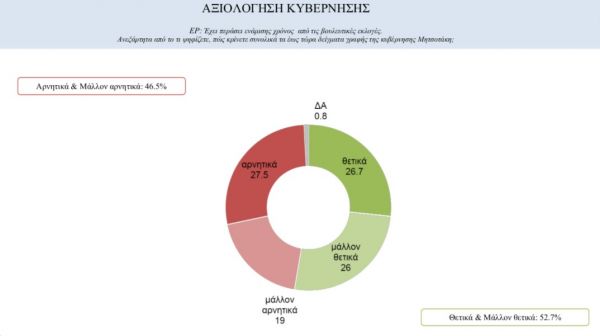 Το 52,7% αξιολογεί συνολικά θετικά τα πεπραγμένα της κυβέρνησης στον 1,5 χρόνο που βρίσκεται στην εξουσία. Στον αντίποδα, αρνητικά αξιολογεί την κυβέρνηση το 46,5%.