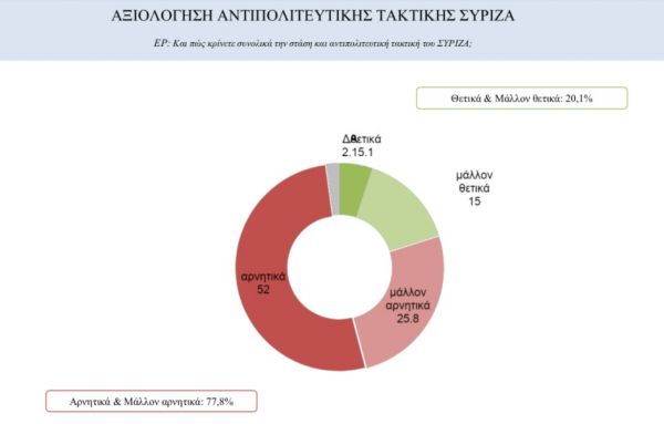 Το 77,8% αξιολογεί αρνητικά ή μάλλον αρνητικά την αντιπολιτευτική τακτική του ΣΥΡΙΖΑ, ενώ το 20,1% αξιολογεί τη στάση της αξιωματικής αντιπολίτευσης θετικά ή μάλλον θετικά.