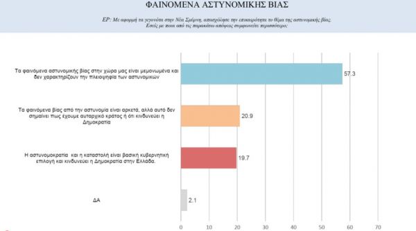 Σχετικά με τα περιστατικά αστυνομικής βίας, το 57,3% εκτιμά πως αυτά είναι μεμονωμένα και δεν χαρακτηρίζουν την πλειοψηφία των αστυνομικών. Το 20,9% εκτιμά πως τα φαινόμενα βίας είναι αρκετά, αλλά αυτό δεν σημαίνει πως έχουμε αυταρχικό κράτος. Το 19,7% απαντά πως η αστυνομοκρατία είναι βασική κυβερνητική επιλογή.