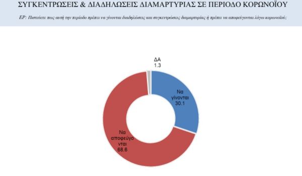 Την ίδια στιγμή, το 68,6% πιστεύει πως θα πρέπει να αποφεύγονται οι διαδηλώσεις εν μέσω πανδημίας, ενώ το 30,1% θέλει να συνεχίζουν να πραγματοποιούνται.