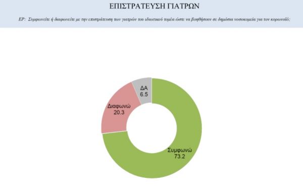 Ως προς το «καυτό» θέμα των ημερών, την επιστράτευση γιατρών του ιδιωτικού τομέα, δηλαδή, προκειμένου να συνδράμουν το ΕΣΥ, που πιέζεται λόγω της έξαρσης της πανδημίας, το 73,2% εμφανίζεται σύμφωνο με την απόφαση της κυβέρνησης, ενώ το 20,3% διαφωνεί.