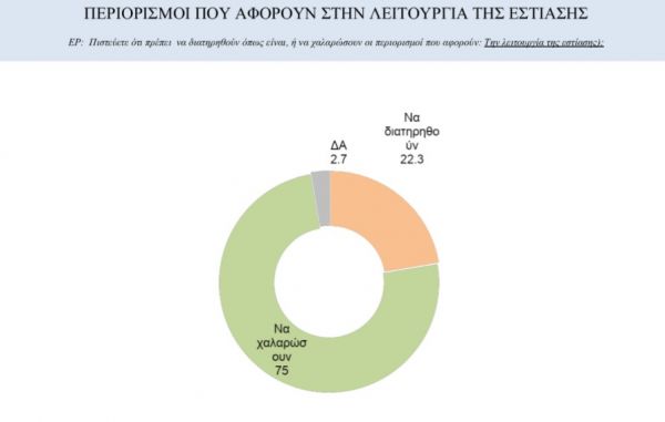 Τέλος, το 75% θέλει χαλάρωση των περιορισμών – άνοιγμα – που έχουν επιβληθεί στην εστίαση, ενώ το 22,3% θέλει τη διατήρησή τους.