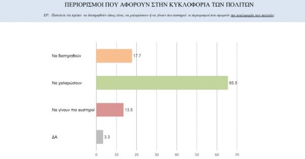 Το 65,5% των πολιτών ζητά χαλάρωση των περιορισμών στην κυκλοφορία, με το 17,7% να θέλει διατήρηση των υφιστάμενων μέτρων, ενώ το 13,5% ζητεί αυστηροποίησή τους.
