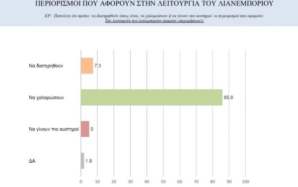 Αντίστοιχα, η συντριπτική πλειοψηφία των πολιτών, ποσοστό 85,9%, ζητά χαλάρωση των περιορισμών που αφορούν στο λιανεμπόριο, το 7,3% ζητά διατήρησή τους, ενώ το 5% θέλει αυστηροποίηση.
