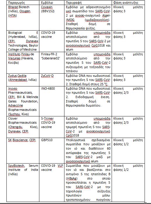 Σημαντική είναι επίσης η ευρεία γεωγραφική κατανομή αυτών των προσπαθειών. Τα κυριότερα από τα εμβόλια που βρίσκονται υπό ανάπτυξη σε χώρες μέτριου και χαμηλού εισοδήματος συνοψίζονται στον Πίνακα.
