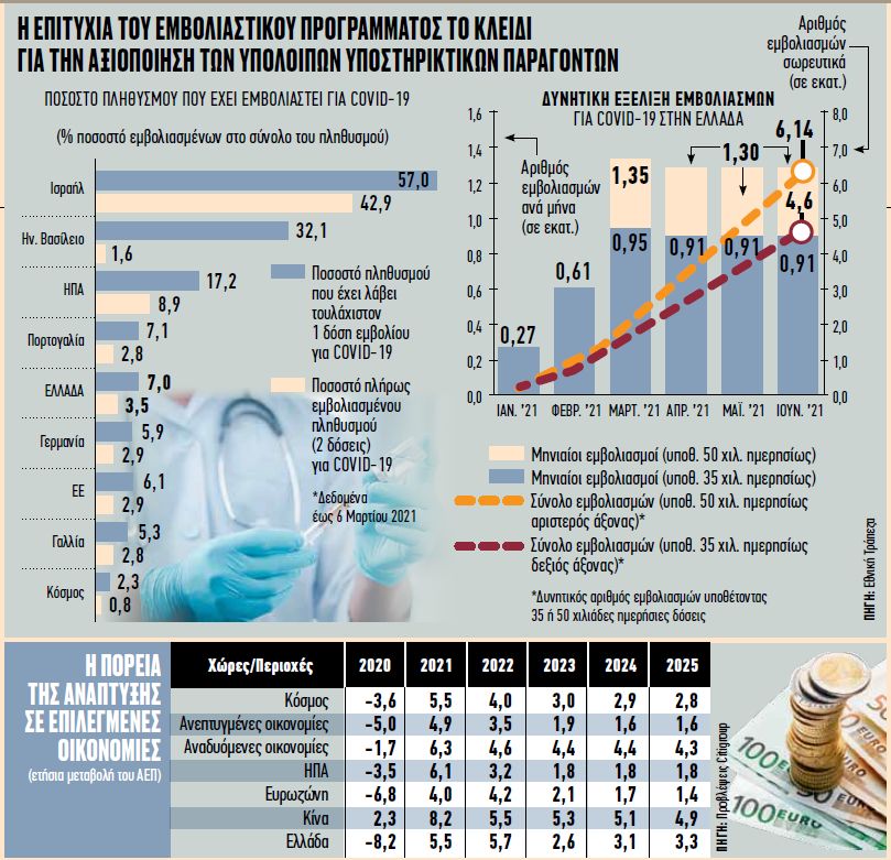 Από την άλλη πλευρά, στην Ελλάδα, σύμφωνα με τη διεύθυνση οικονομικής ανάλυσης της Εθνικής, με μέσο αριθμό εμβολιασμών 35 χιλιάδες ημερησίως, οι ευαίσθητες πληθυσμιακές ομάδες θα εμβολιαστούν ως τα τέλη Ιουλίου, με 50 χιλιάδες ημερησίως το 70% περίπου του πληθυσμού θα έχει εμβολιαστεί μέχρι τις αρχές του 4ου τριμήνου επιτυγχάνοντας ουσιαστικά πλήρη έλεγχο της πανδημίας, ενώ αν έρθουν και άλλα εμβόλια μονής δόσης, η ανοσία της αγέλης θα μπορούσε να επιτευχθεί νωρίτερα.