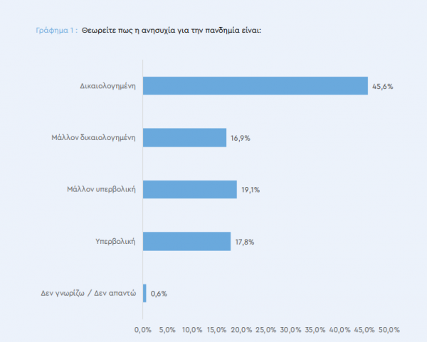 Έξι στους 10 ερωτώμενους (62,5%) δήλωσαν ότι η ανησυχία για την πανδημία είναι δικαιολογημένη/μάλλον δικαιολογημένη. Από την άλλη πλευρά, καταγράφηκε ένα υψηλό ποσοστό του δείγματος (36,9%), που δήλωσε ότι η ανησυχία για την πανδημία είναι υπερβολική/μάλλον υπερβολική, με τους τελευταίους να συγκεντρώνονται κυρίως στις βαθμίδες χαμηλότερου εκπαιδευτικού επιπέδου, χαμηλότερου εισοδήματος, κατοίκους χωριών και στους ανέργους.