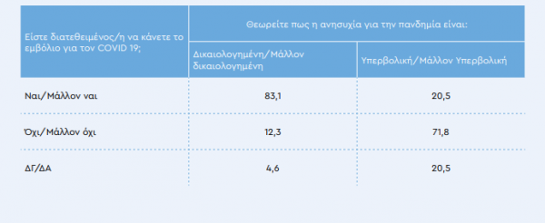 Περίπου οι ίδιες διαπιστώσεις ισχύουν και για την πρόθεση των ερωτώμενων να εμβολιαστούν, καθώς σχεδόν οι ίδιοι που δήλωσαν ότι δεν ανησυχούν για την πανδημία δήλωσαν ότι δεν προτίθεται εμβολιαστούν.