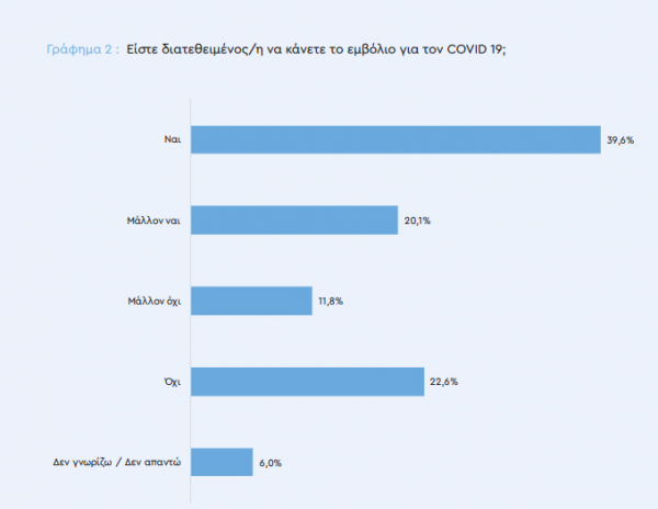Συγκεκριμένα, σχεδόν 6 στους 10 ερωτώμενους (59,7%) δήλωσαν την πρόθεσή τους να εμβολιαστούν, έναντι του 34,4% που δήλωσε ότι δεν είναι διατεθειμένο να κάνει το εμβόλιο για την Covid-19, ενώ καταγράφεται και ένα σημαντικό ποσοστό (6%) που δεν έχει αποφασίσει ή δεν απάντησε στην ερώτηση.