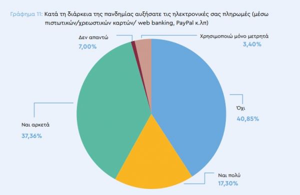 Η πανδημία φαίνεται πως αλλάζει τη συμπεριφορά των ατόμων στις οικονομικές τους συναλλαγές. Σχεδόν 4 στους 10 (36,6%) ερωτώμενους αύξησαν τις ηλεκτρονικές τους αγορές, ενώ πάνω από 5 στους 10 (54,7%) αύξησαν τις ηλεκτρονικές τους πληρωμές. Και οι δύο συμπεριφορές φαίνεται να σχετίζονται θετικά με το εκπαιδευτικό επίπεδο και το εισόδημα.