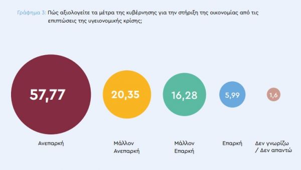 Όσον αφορά την επάρκεια των μέτρων στήριξης της οικονομίας που έχει λάβει η κυβέρνηση, το 76,1% θεωρεί πως τα μέτρα είναι ανεπαρκή ή μάλλον ανεπαρκή, με τους ανέργους να εμφανίζουν το μεγαλύτερο ποσοστό αρνητικής αξιολόγησης.