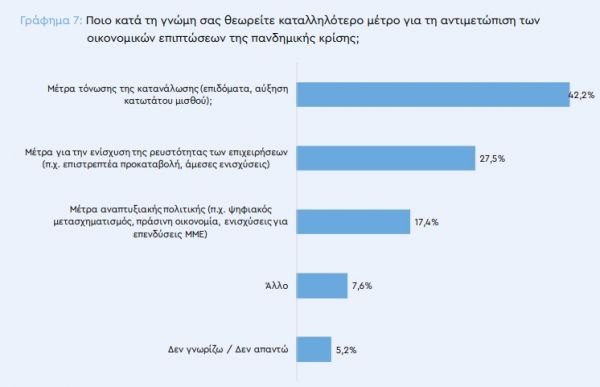 Όσον αφορά τα μέτρα που πρέπει να υιοθετηθούν για την αντιμετώπιση των συνεπειών της υγειονομικής κρίσης στην οικονομία, το 42,2% του δείγματος θεωρεί πως τα μέτρα θα πρέπει να στοχεύουν στην τόνωση της κατανάλωσης, το 27,5% σε μέτρα ενίσχυσης της ρευστότητας των επιχειρήσεων, ενώ το 17,4% σε μέτρα αναπτυξιακής πολιτικής.